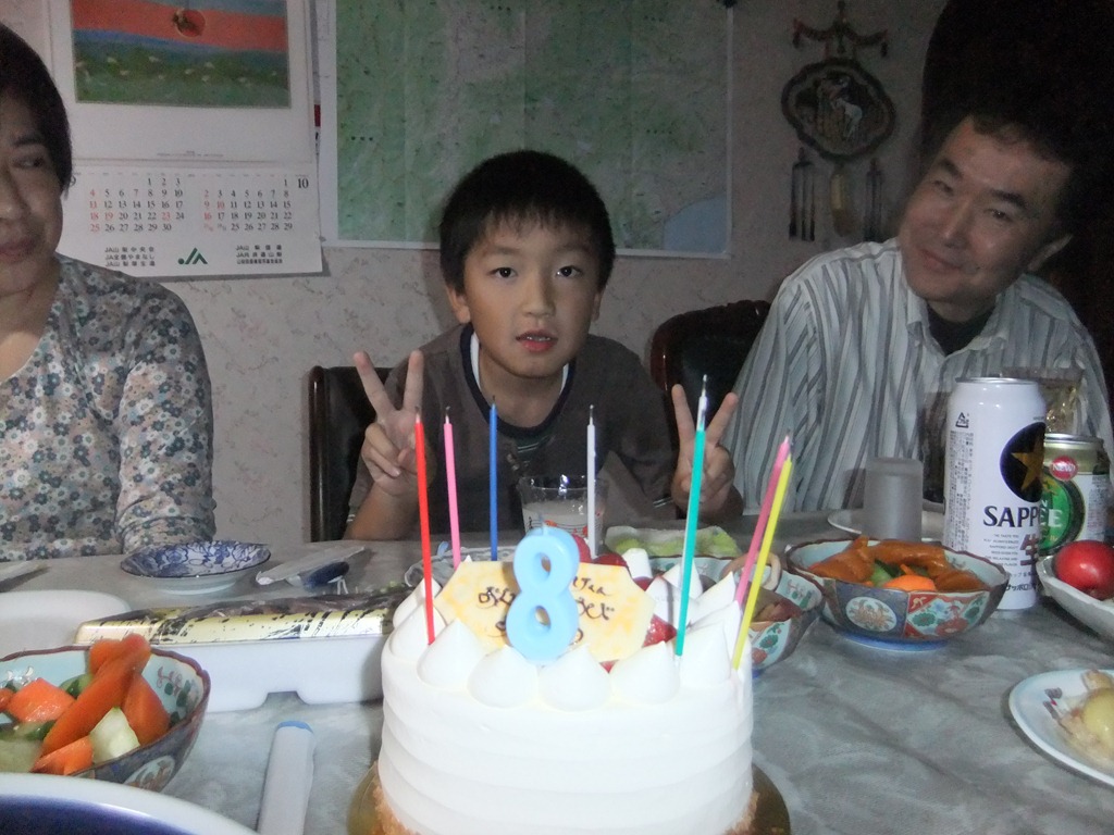 皆様、こんばんは、5日長女の子供(孫」男の8歳の誕生会が我が家でおこないました。内孫の4年生の長女のハッピパスティのピアノの演奏で全員で合唱で始まり、司会もおこないました。ケ―キに灯がつけられました。、お爺さんから挨拶してください、と、言われ金一封〔お爺さんと、おばあさん」からのお祝い2万円渡し元気で素直な良い子に育つよう言葉がありました。全員が一言ずつ言われ最後にお礼の言葉を述べました。画像2内孫の幼稚園年長の歌舞伎の恰好を見せ、大笑いでした。内孫の2人が3曲の合唱と演芸を見せてくれ、プレゼント「フ-ド付の」上着とパンツを3枚渡し早速着て見せました。料理(から揚げ、馬刺し、ぶりの照り焼き、八幡いもとイカ煮、サラダ、ビビンバ、なめこ汁、などです。孫たちが、結婚するまで元気でいられることを願っています。約3時間でしたが楽しい会ができました。年間4回このような会をおこなっています。 5日 内藤初三。