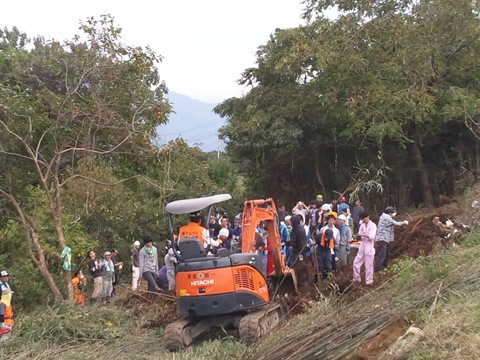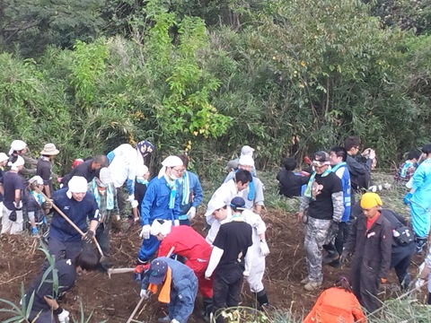 握手の風景です 参加者全員が素朴で一生懸命作業しました 自動販売機も何もない場所で 用意した麦茶はすぐなくなり