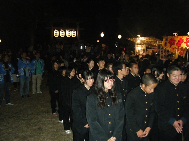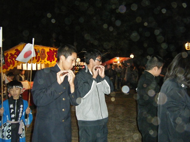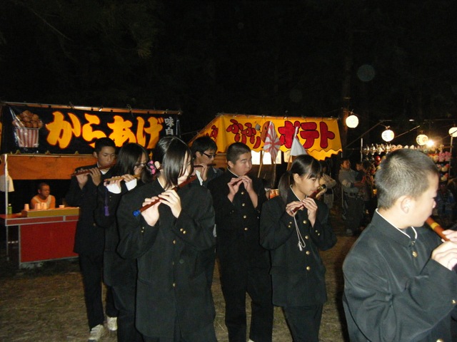 韮崎市清哲町青木地区では、ずーっと昔からこの秋祭りが行われていました。きちんと聞いたことはありませんが、明治、大正時代は行われていたようです。その前はわかりません。神輿をかついで境内を走り回るお祭りです。その神輿がかつがれる前に、楽隊といって男の子が旗や花を持ち大太鼓、小太鼓、シンバル、横笛の演奏です。楽譜を見たことはありませんが、毎年9月に入ると夜子どもたちの練習が始まります。「ドンドンとピーヒャララとタカタカタカタカタカ」と繰り返して行きます。この音を聞くと秋も深まるなーと思います。今は、子どもの数が減り中谷部落と青木部落の楽隊と神輿の祭りで男の子だけではできなくなり、写真のように女の子が男子の学生服を借りて男の子に扮して演奏に加わっています。まだ足りないところには大人も入ります。小学生、中学生で行うのですが、今年は高校生にも参加してもらいました。素直な気持ちで参加する子どもたちにジーンと来ます。
