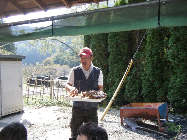 ① 小野議員のお話 ② 準備ok お話を聞く皆さん ③ 松茸のお話をする吉田さん