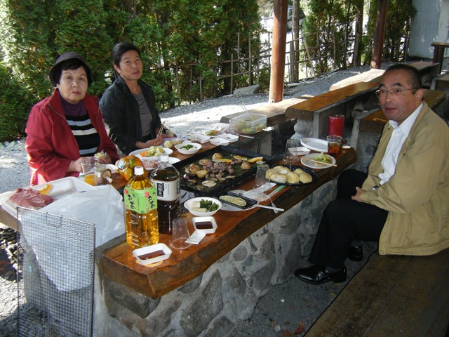 赤い帽子をかぶった吉田さんが昨日から今朝早くに取ってきたマツタケをいただきながらのバーベキューです。