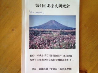 7月15日(日)16日(月)に渡り、山梨県男女共同参画推進センターにて、「第4回 あまえ研究会」が開催されました。甲府市和戸の新津小児科の新津直樹先生が会長を務められている会で、日本外来小児科学会ワークショップ「あまえ療法」に起因するそうです。