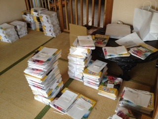 ちびっこはうすが毎月発行している、山梨の子育て情報誌「ちびっこぷれす」1万4000部は月末に出来上がると全部、ちびっこはうす事務局に届きます。待ち受けていた編集部員とボランティア達は、県内400か所へ届けるための仕分け作業を開始します。「〇〇図書館に50部」「△△支援センターに30部」「助産師会さんに100部」というように、配布場所ごとに輪ゴムでまとめて、配布場所名と配布してくれるボランティアさんの名前を貼り付けます。