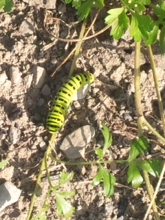 この幼虫は、アゲハ蝶です。小学校の夏休みの自由研究で日記をつけたのでよく覚えています。気持ちの悪い柄がアゲハ蝶の綺麗ながらになります。そのうち、綺麗なアゲハ蝶が、飛びまわりますよ。こわくないですよ。16日誠子