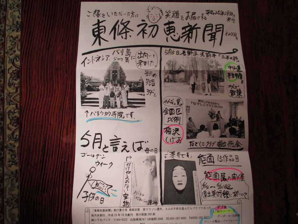 新聞の投稿ありがとうございます、主人の能面展も、投稿していただきまして、有難うございました、田植えも、たいへんでしたね、6月1日.東條初恵、