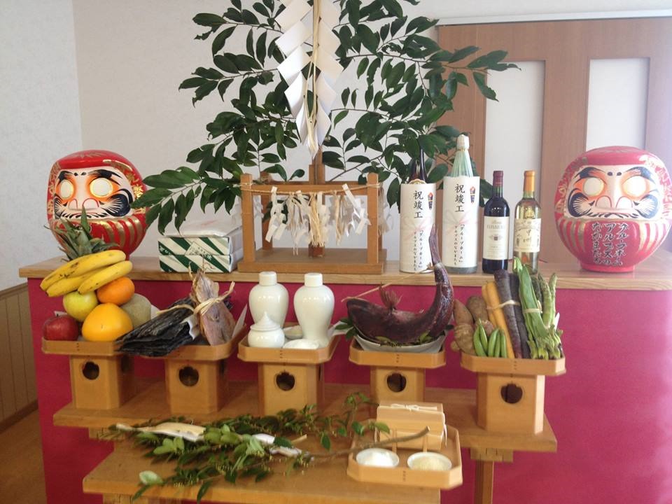 写真は、竣工式の祭壇です。季節の野菜が美しく飾られ、大きな鯛は今にも飛び跳ねそうな立派な祭壇でした。