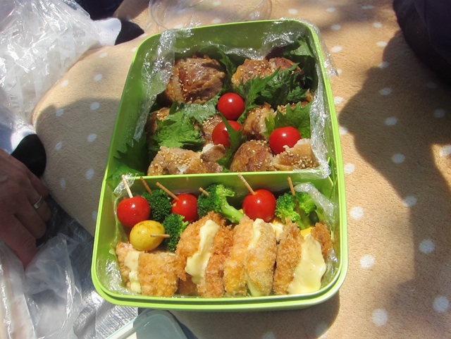 学校の生徒数は650人以上の大きな小学校でした。運動会のお弁当は、パパが会社を休んで作ってくれたそうです。1) 牛肉を巻いたおにぎりと、鮭をフライにしてチーズはさみ、3) うずらの卵をカレー粉で、味を付け、ブロッコリーとトマトを串にさし、4) ピーマンを、お湯に通して、ポテトサラダを詰めたものです。5) 「さくらんぼ」もありました。ご覧になって下さい。