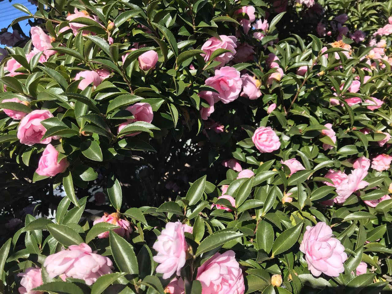 4日.午前中、韮崎市「秋山脳外科2階」にある、スポーツ→トレ-ニングに行ってきました、足、腕、胸、背、ランニングマシーン等、1時間ほど、トレーニングしたら、もう、クタクタでしたが、外に出てきたら、病院の庭に、優しい色の、ピンクのサザンカが、いっぱい咲いていて、疲れた気持ちも、吹っ飛んでしまいました、!ご覧になって下さい。