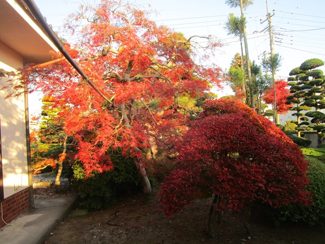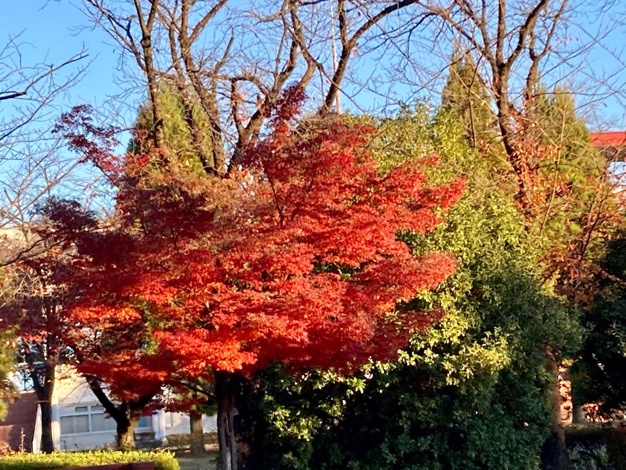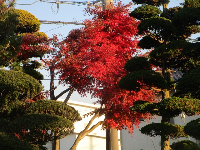 19日.笛吹市一宮病院へ行く途中、金川の森公園の近くの紅葉です、高くそびえる木々の紅葉と、夕方、我が家の西側にある、こま共立病院の屋上が(16時53分)真っ赤に夕焼けになっていましたので→写真に撮りました