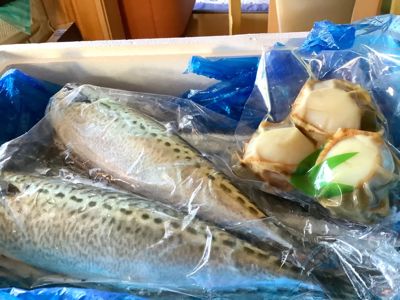 23日.岩手県大船渡市の、産直グループの上野さんから、大きなサンマと、サバと、焼きホタテが、届きました、今晩の夕食には→さんまを焼いて.焼きホタテを、いただこうと思っています。新鮮な魚をご覧になってください、
