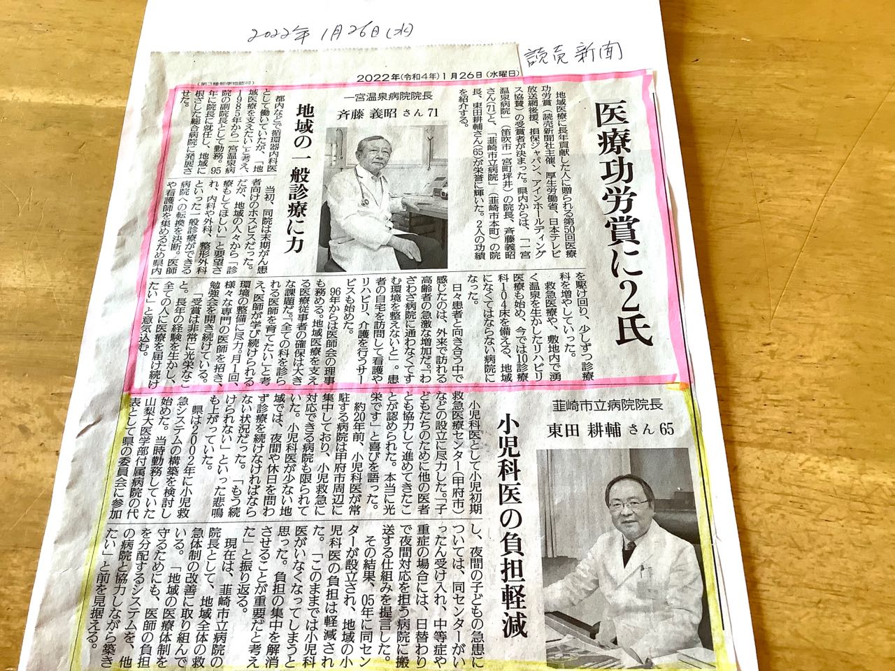 26日.今朝の読売新聞→12班→地域24の紙面に、一宮温泉病院の斉藤義昭院長先生と、韮崎市立病院院長→東田耕輔先生と、お二人で、医療功労賞を受賞して、大きく新聞に載っていました、、一宮温泉病院の斉藤院長先生には、やまなし女性異業種の会が、初会以来、25年以上も、経営者の健康管理について、会員が一宮温泉病院に、出向き長い間勉強させていただいていましたので、こんなに嬉しい記事を拝見して、早々に、やまなし女性異業種の会の会長として、会からも、斉藤院長先生に、お祝いのお花として胡蝶蘭を、お届けする、手配をとりました、救急医療や、地域内で沸く温泉を生かし、リハビリ医療も始め、地域には、なくてはならない病院になり、すべての人に医療を届け続けたいと、話してます、ご覧になってください、