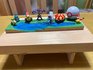 30日.オミクロンで、小学校と保育園がお休みで、2人の男の子(孫)は、ジィージの→能面の工房から、ジィージが、いない間に、いらなくなった.木切を持ってきて、テンコ(金づち)で叩いたりドライバーをさしたりしながら、木に沈んだところを作り、そこへ絵の具で水色を塗り、池を作り、絵の具で全体を塗ってから、今度は、その周りに、小動物を置いて、まるで、絵に出てくる光景を作り、私は素晴らしい作品にびっくりするばかりです、その作品を載せるための、台を作って、台の上に、完成した作品を載せていました、ご覧になってください、