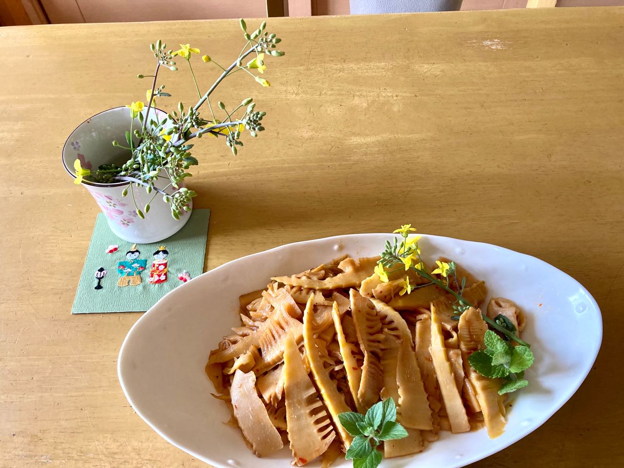 菜の花は→我が家の畑の→「野良ボー菜の花」です。ミントの葉も.添えてみました。、ご覧になって下さい、