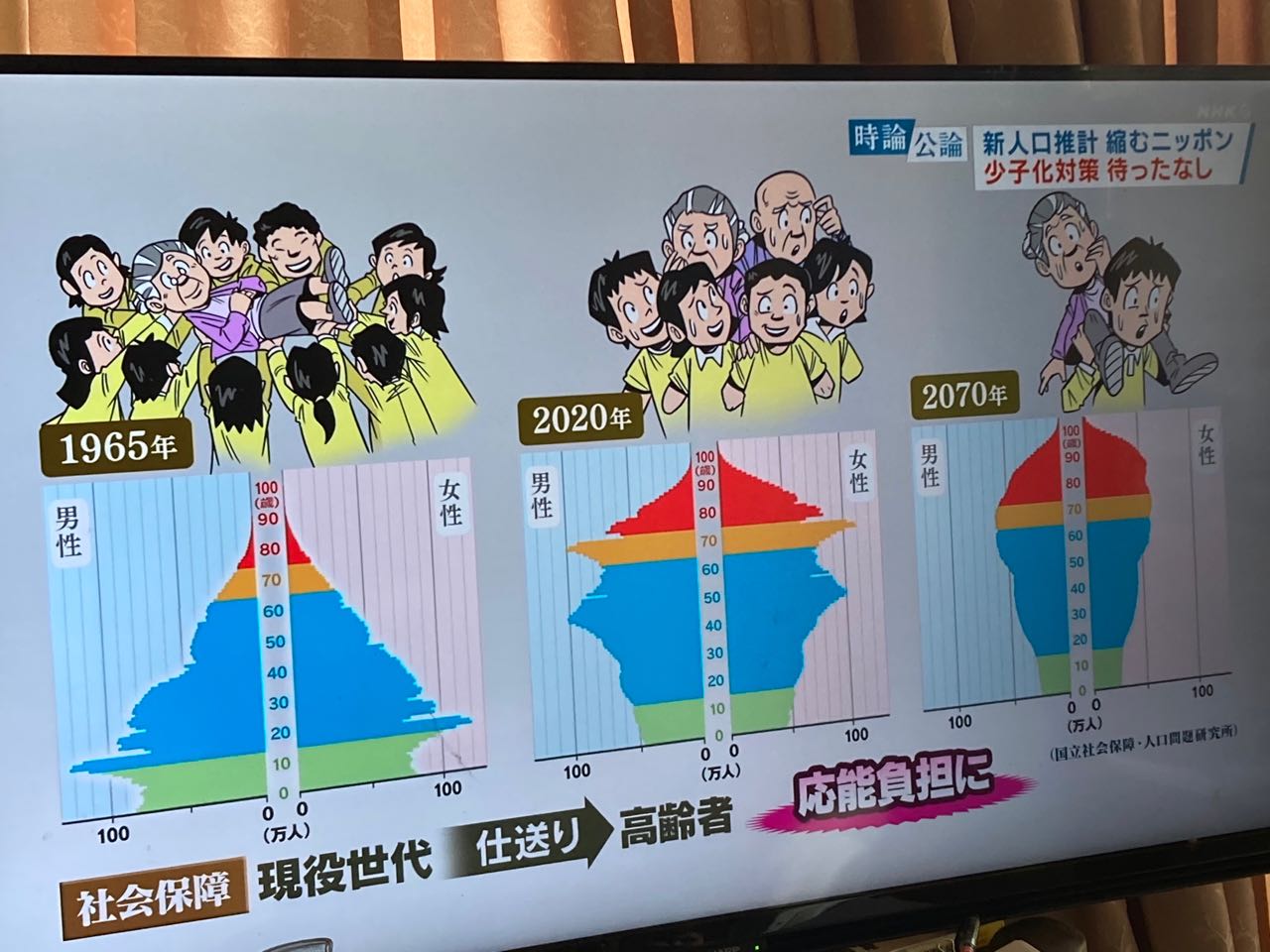 4日.持論公論、1965年度は、7人て、お年寄り3人を、支えていますが、→2020年には、4人が、2人を支えています、→2070年少子→高齢化まった、無し、一人が、ひとりを支えております。この先、どうなってしまうのでしょうか、ご自分の年齢に合わせてご覧になってください。 2023年5月4日、テレビを、撮影、東條初恵