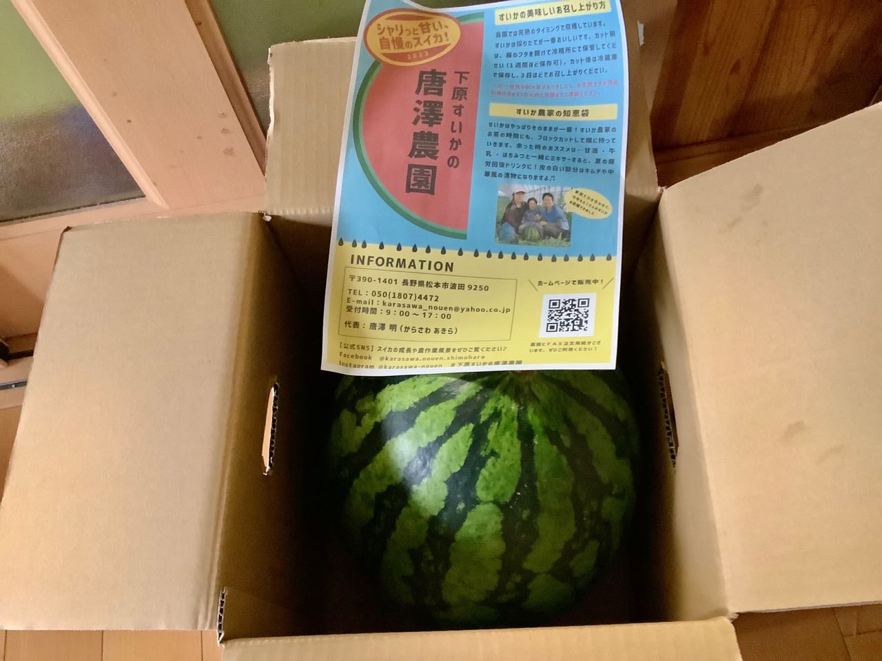 9日.長野県松本市の→スイカ、農家から.大きな.5Lのスイカが届きました、こんなに大きな、スイカは、はじめて見ました、次女Akikoさんが、グループホームへ持っていって、入居者の皆さんに、スイカ割りを、楽しませてあげたいと、言っています、唐沢農園の、甘い自慢のスイカです