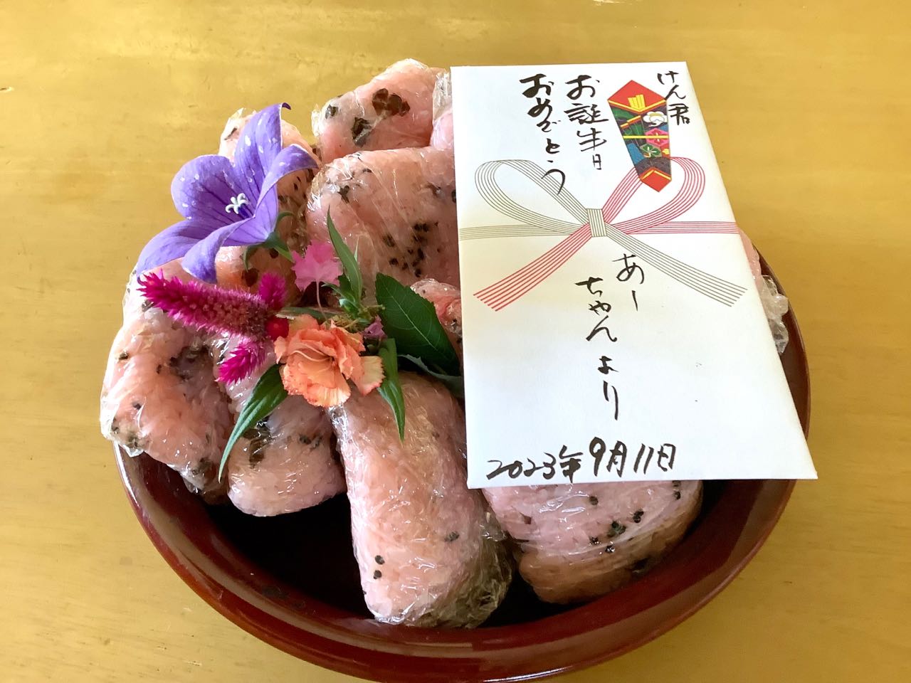 11日.今日は息子の.次男→賢也君の.お誕生日です。今朝.お赤飯を炊いて、神様や仏様にお供えしました.ケーキは既に注文してあります.今日.午後4時ごろ.取りに来るそうですので、待っています、お家の.庭先にある.ちぃちゃな.お花を、添えて写真を撮りました、お祝いの袋の裏にはメッセージを、ぎっしり書いておきました。賢君は.小さい時、、いつも、私の名前を、あーちゃんと言っていましたので、あーちゃんよりと書いておきました、写真を撮りましたので、ご覧になってください。