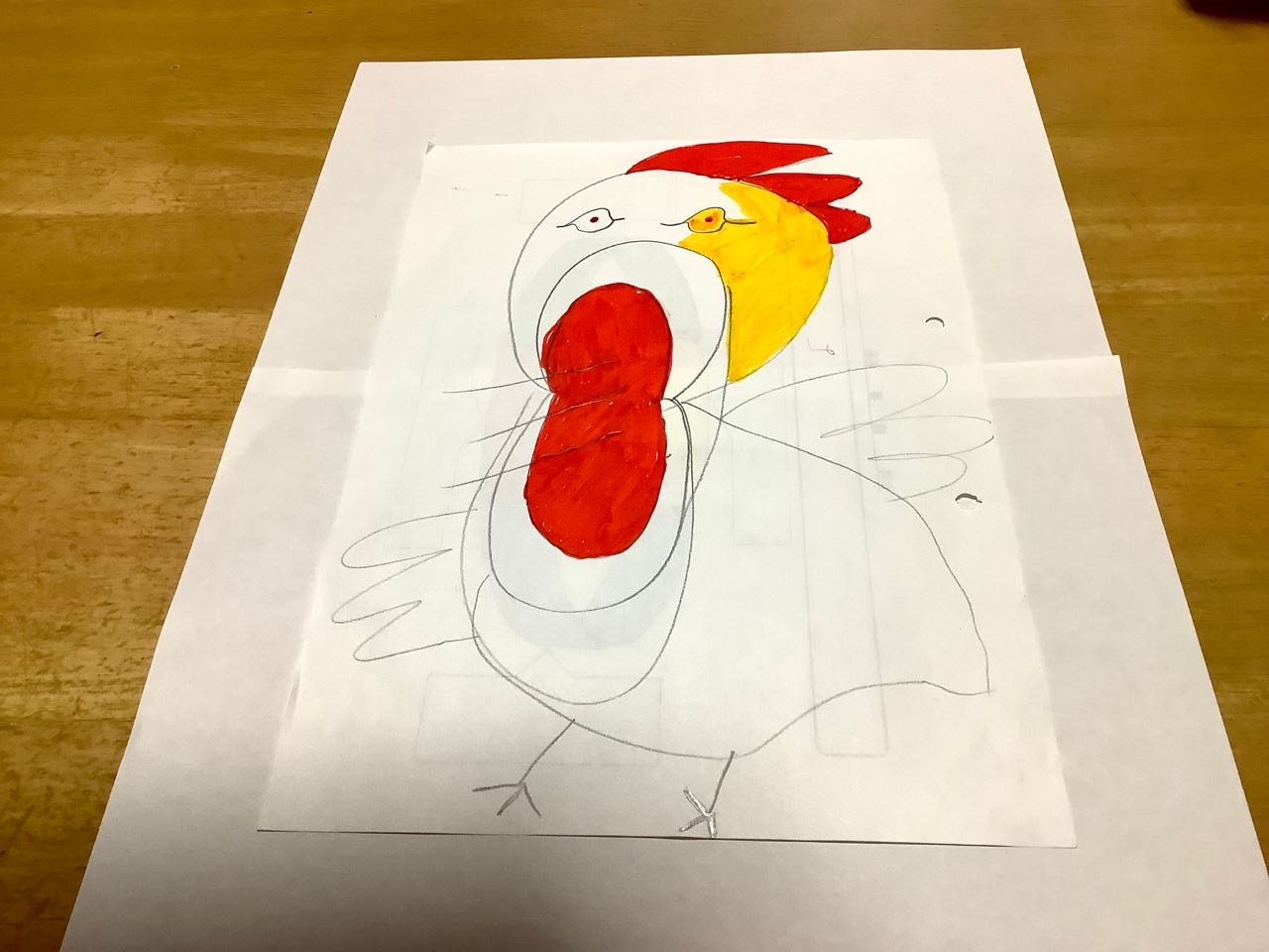 14日.小学校3年生の孫.男児が、学校から帰ってきてすぐ、私の家に来て→ちゃあちゃん→きょう..鶏さんの絵を書いたから、見てくださいと.言って.私に手渡してくれました。..描いた絵は、まだ未完成ですが、見た瞬間、ニワトリの、心が伝わってきました、よくこんなに上手に.書けたね.と.ビックリして、褒めてあげました、孫の感性が豊かな心、、素直な心に..きっと、ニワトリの心に.なって描いんだナ..と、思いました、私も絵を見て、ビックリしたのは、鶏さんも、大きな口を開けて→→コケコッコーと泣いてる姿は、お口から大きな.声が出てきているような.感じがしました、ニワトリさんの目は、、とっても優しい瞳をしています、頭の→トサカも真っ赤で.よく描けています、まだ未完成ですけど、完成が待ち遠しいです、