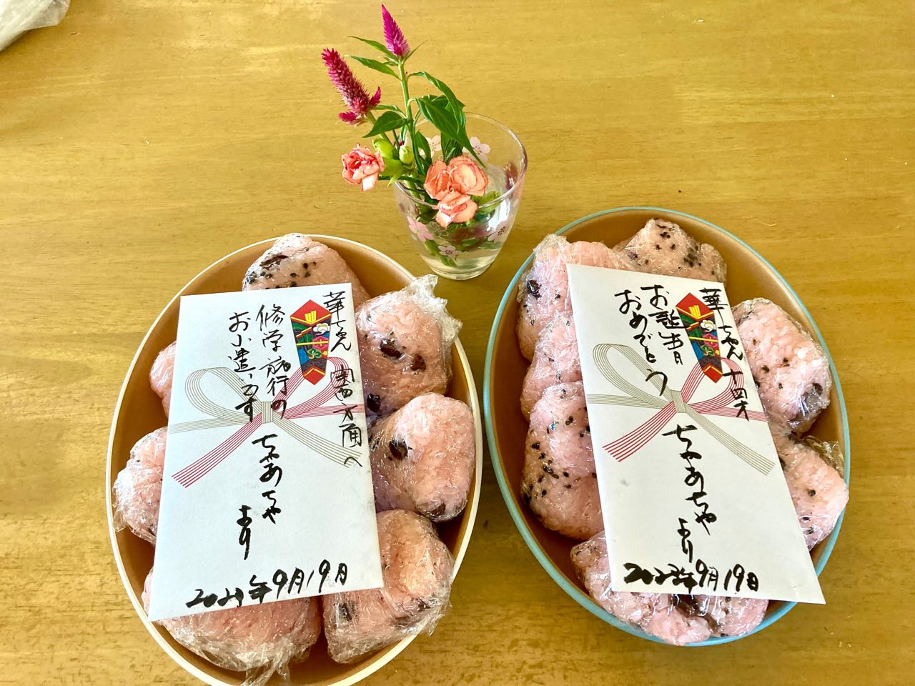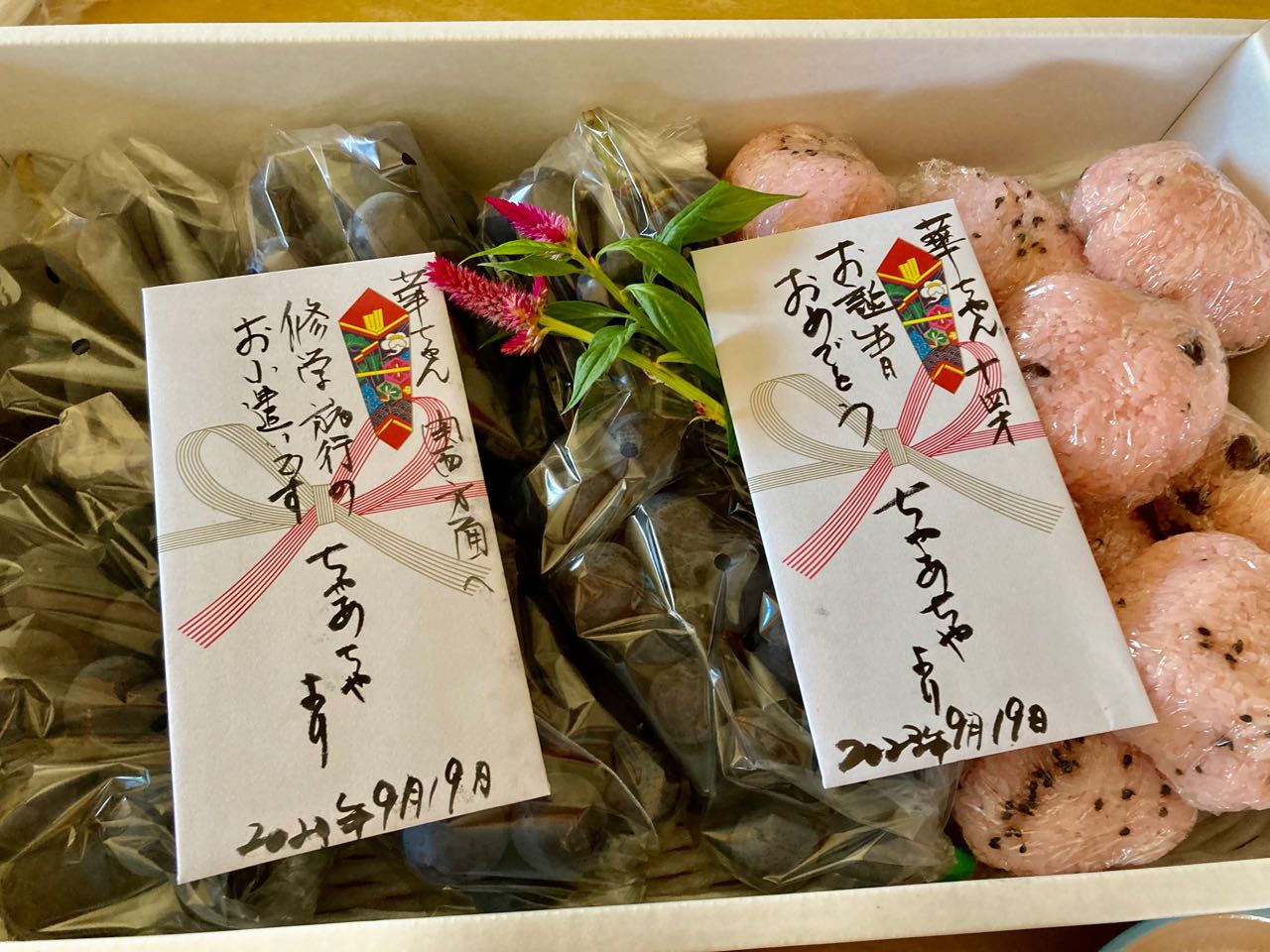 先日9月上旬に.関西方面へ修学旅行に行きましたので、修学旅行の.お小遣いも.入れて置きました..お祝いの封筒の裏には、小さい時からの、楽しい思い出や、これからの未来に向けた、メッセージを、いっぱい.ぎっしりと、書き切れないほど書いて、送りました、ママには、山梨県の、大きなぶどう、ピオーネ」を、たくさんと、「新茶」を.1本入れて.プレゼントです。今朝1番で8時20分までに.クロネコヤマトに、一邦さんか、持ち込みました。今夜18時には、届くと言う事ですので安心です。