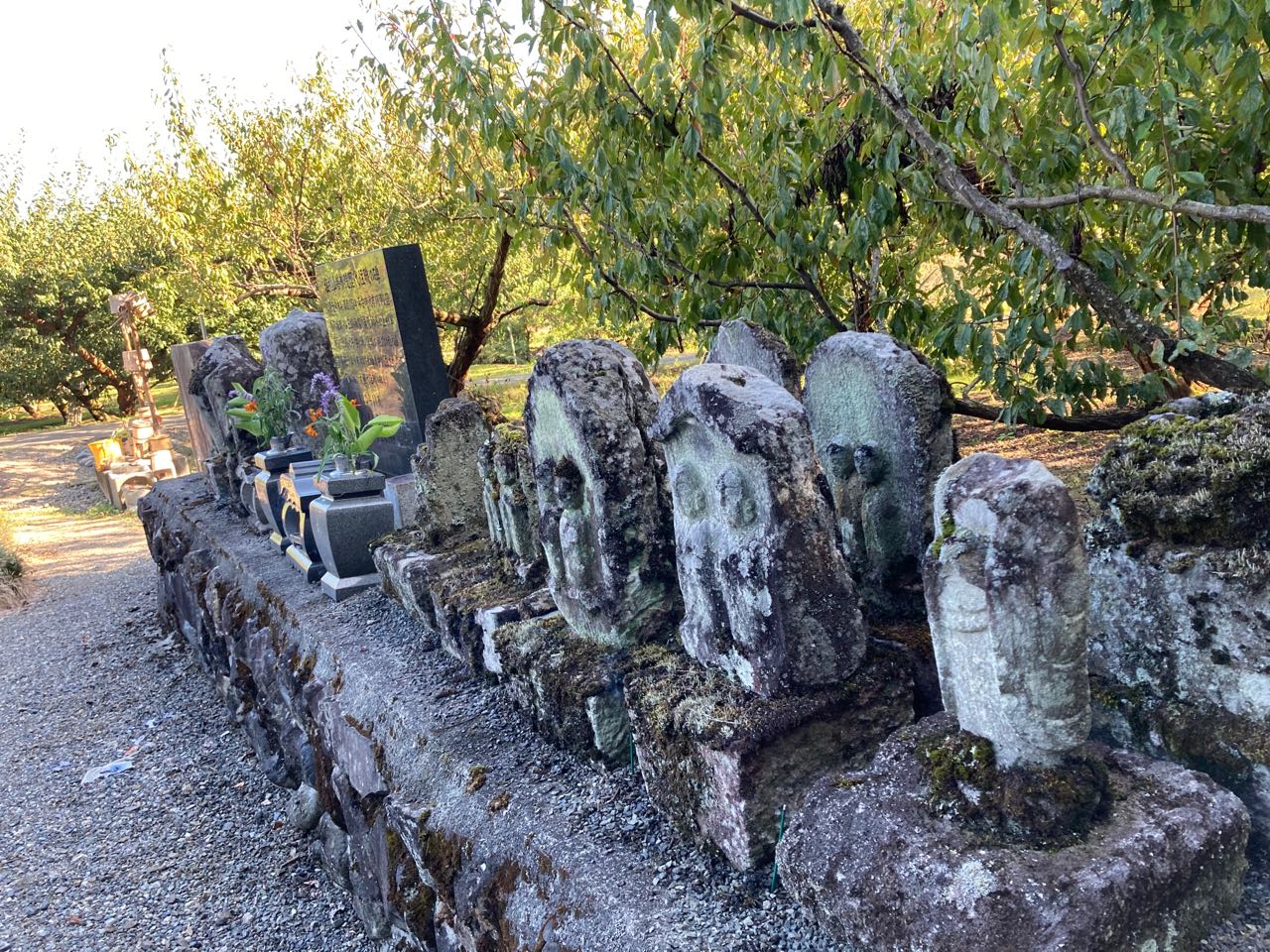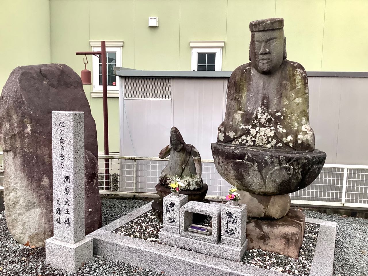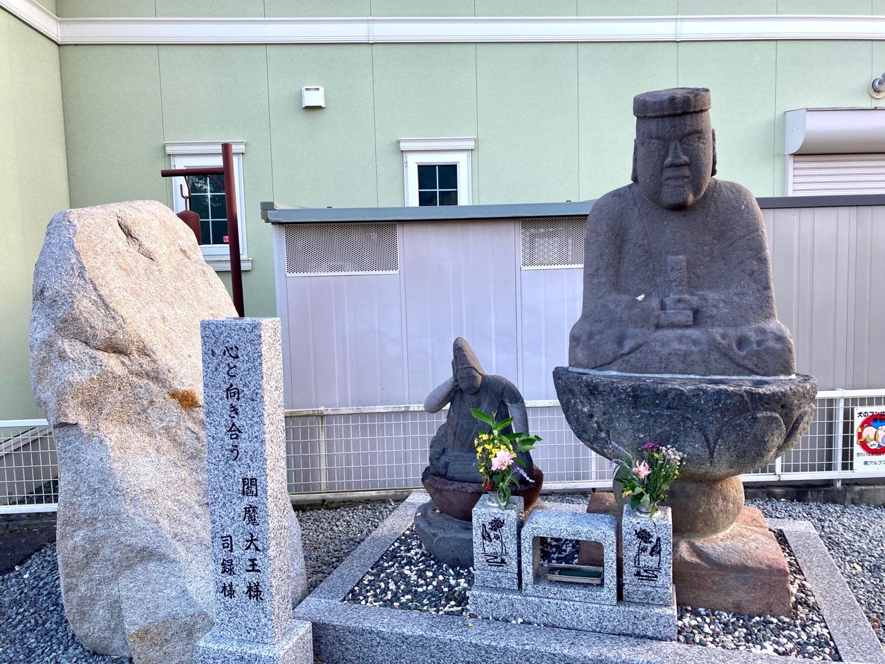 19日.昨日午後から→亡き、両親の墓参りを済ませてから.南アルプス市、飯野、常楽寺の.お寺さんの、山門の前に→眠っている.閻魔大王様の.墓参りも.済ませてきました。 2ヶ月ほど前に.閻魔さんの.御身体に、沢山の→苔(コケ)が.生えていましたが、中込石材屋さんに.頼んで.お彼岸までに、その苔を.お願いして取り除いて、もらいました。昨日は、とてもきれいな、閻魔大王様の、お姿で嬉しくなりました。我が家の庭に咲いている、ダリアの花と.紫の花を添えてくれました、