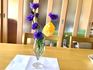 13日.大好きな→「ダリアの苗」を取り寄せて、庭先に、植え付けました、7歳の孫が、庭先から、お花を撮って来ましたので、コップにさしてあげました、今、矢車草が咲き、初めました、黄色いチューリップとピンクのチューリップと、芝桜とスミレも、取って来ましたので、お皿に、飾ってあげました、ご覧になって下さい、