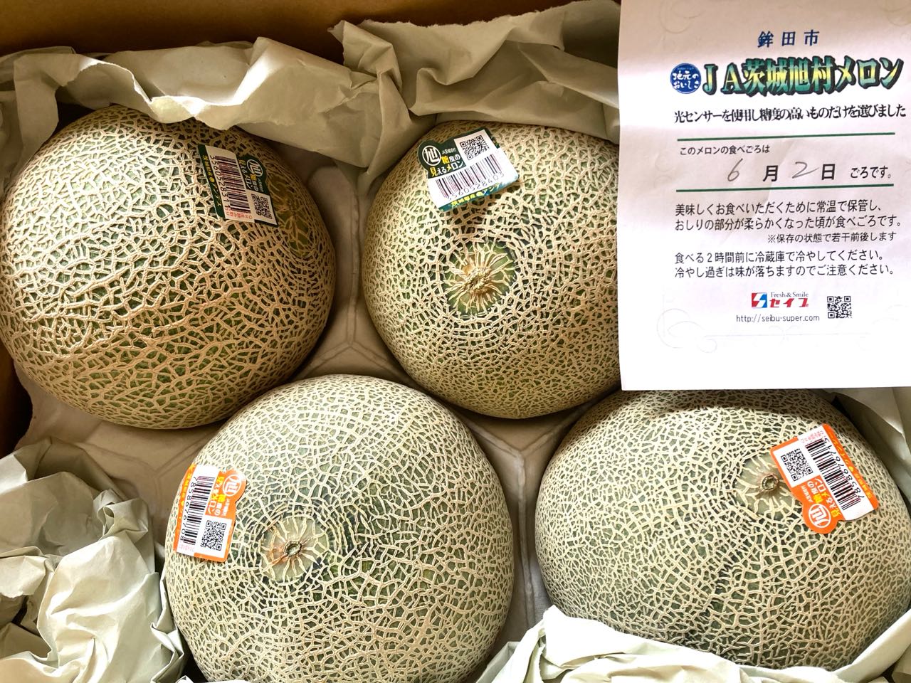 1日.茨城県水戸市に.お住まいの→木内令子様から→「大きなメロン」が、たくさん届きました、光センサーを使用した、糖度の高いものだけを選んだ、糖度が見えるメロンだそうです、冷蔵庫で2時間前に冷やして食べるのが、おいしい食べ方だそうです。、これから食べるのが楽しみです、木内さんは、茨城県中央会の女性部の次長をしておりました、、私も何回も、依頼されて→講演に行ったことを覚えています、