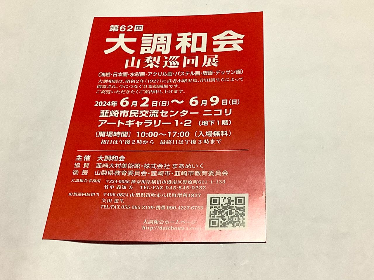 第62回→「大調和会」→山梨巡回展が、 6月9日まで、韮崎の、ニコリの、地下1階に於いて、→「油絵.水彩画.アクリル画.パステル画.版画.デッサン画」のを、開催されています。昨日夕方、甲府通運の矢田専務が、真っ赤な「大調和会の葉書」を、私の自宅まで→届けてくれました。矢田道生専務の、絵画の作品は、素晴らしい作品ばっかりです、心が洗われるほどに、感動いたしますので、ご都合をつけて→韮崎の.ニコリまで、出向いて→ご覧になって下さい、