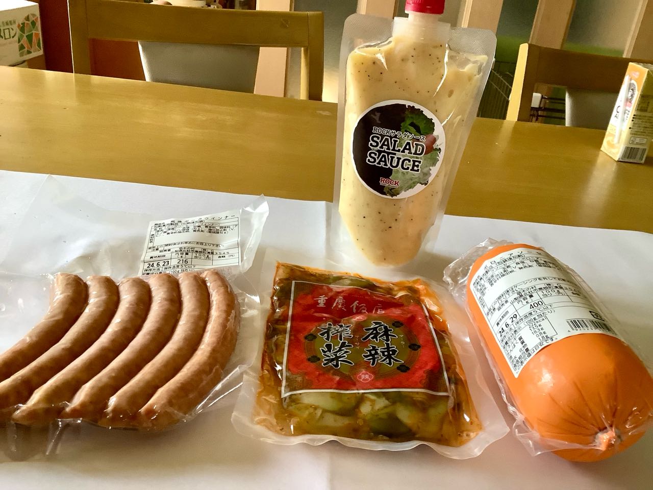 萌の村の→美味しい.ハムと、ソーセージと.サラダソースと.ザーサイを.買って来ました、ビールのつまみに最高です、ご覧になってください、