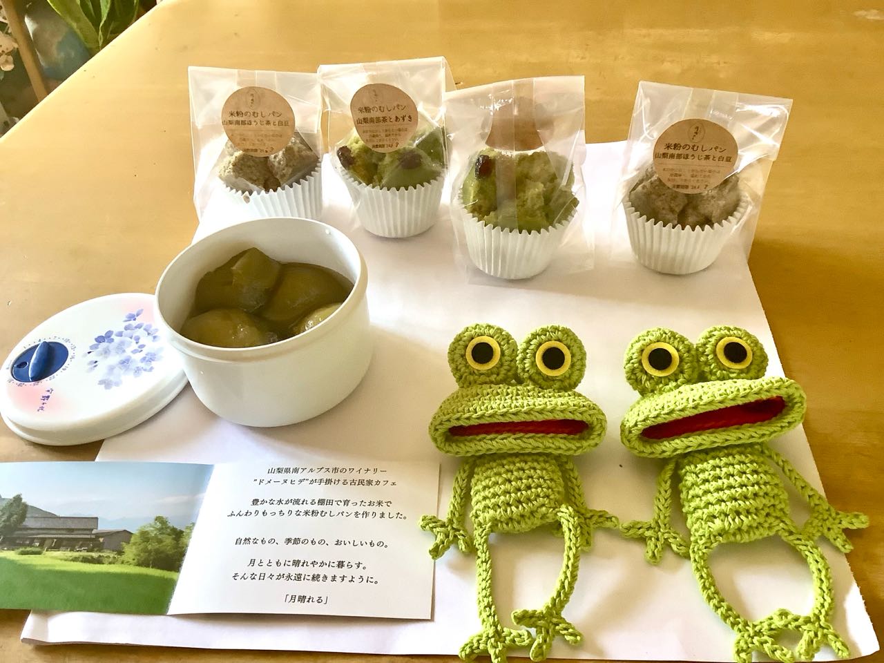 7日.南アルプス市にある、レストラン→」月晴れる」に行って、一緒に参加したお友達が、棚田で育てたお米で.ふんわり、♪もっちりな→1)「米粉」蒸しパンを→お土産に買って下さいました、他の友達からは.2)手作りの.カエルの→ケロちゃんや、3)ブンゴ梅で.漬けた.おいしい→梅漬けも.いただきました.