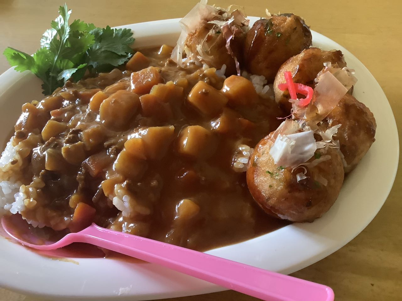 孫9才は、隣の.岡島生活館に行って、自分で「たこ焼き」を買って来て、じいじが作ってくれた。ごろごろカレーに、たこ焼きを載せて.食べていました、