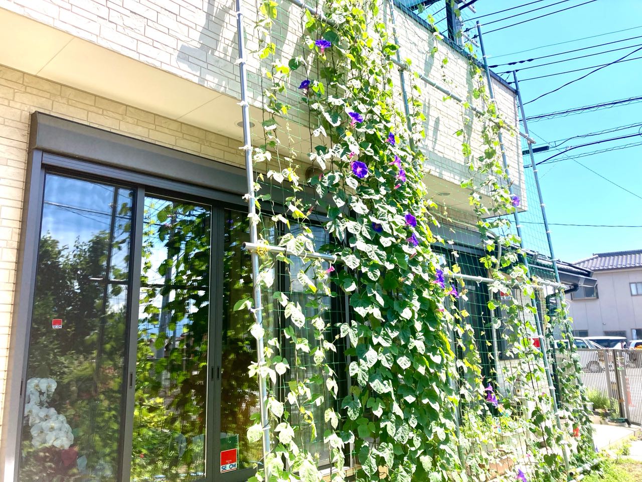 11日. 5月上旬、昨年の芽が、土から出て来た、琉球朝顔の花が.咲き始め.もう.こんなに、ツルが伸びて、2階のベランダ迄、到達しました、ツルが伸びていく棚は、すでに、一邦さんが、キチンと.作ってくれて.有りましたので、スイスイと伸びています、ご覧になって下さい、