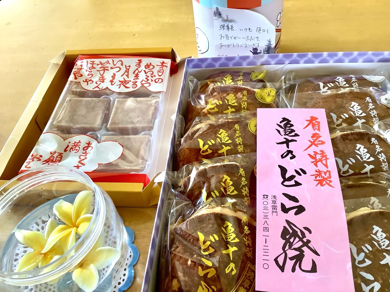 16日.午前10時に→山梨県森林総合コンサルタントの職員研修「6月13日~15日迄」東京→浅草方面に2泊3日で.出かけて来た♪お土産を→篠原総務部長が、金子専務と一緒にと言って届けて下さいました、開けてみて、亀十の「大きな.どら焼き」に.ビックリしました.かなり多くの人が並んで、いた所を、買ってきて.下さったそうです、総務課の職員からも、「芋きんつば」と、「てのりふいなんしぇ」を、いただきましたので、先ほどコーヒーを落とし、美味しそうな→大きな. 「亀十の.大きな.どら焼き」と、薄焼き→芋きんを、いただきました、感謝の.気持ちでいっぱいです.ごちそう様です。