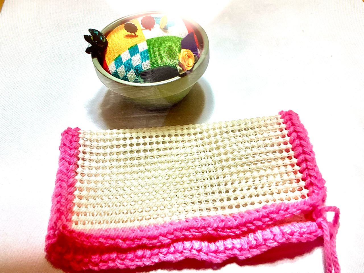 甲府市に.お住まいの、甲府商業高校を卒業した、同級生に、手作りの、1).針刺しと、2)ペットポトルの、固いキャップを取る、手作りの.ビニール製品の布を.頂きました、