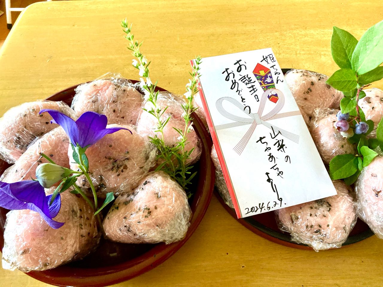 朝早く、お赤飯を炊いて、食べやすいように「おにぎり」にして、 庭に咲いていた「バラの花」や「カーネーションの.花」を取ってきて、お赤飯の上に、飾りました。一邦さんは、お赤飯を炊いてくれて、ありがとうと、言っていました。