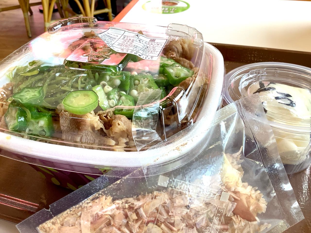 ジムの先生には、「→めかぶ、→かつぶし、→オクラ、→山かけ「ワサビ」→大盛りを注文して、お土産に、持っていきます、ご覧になって下さい、