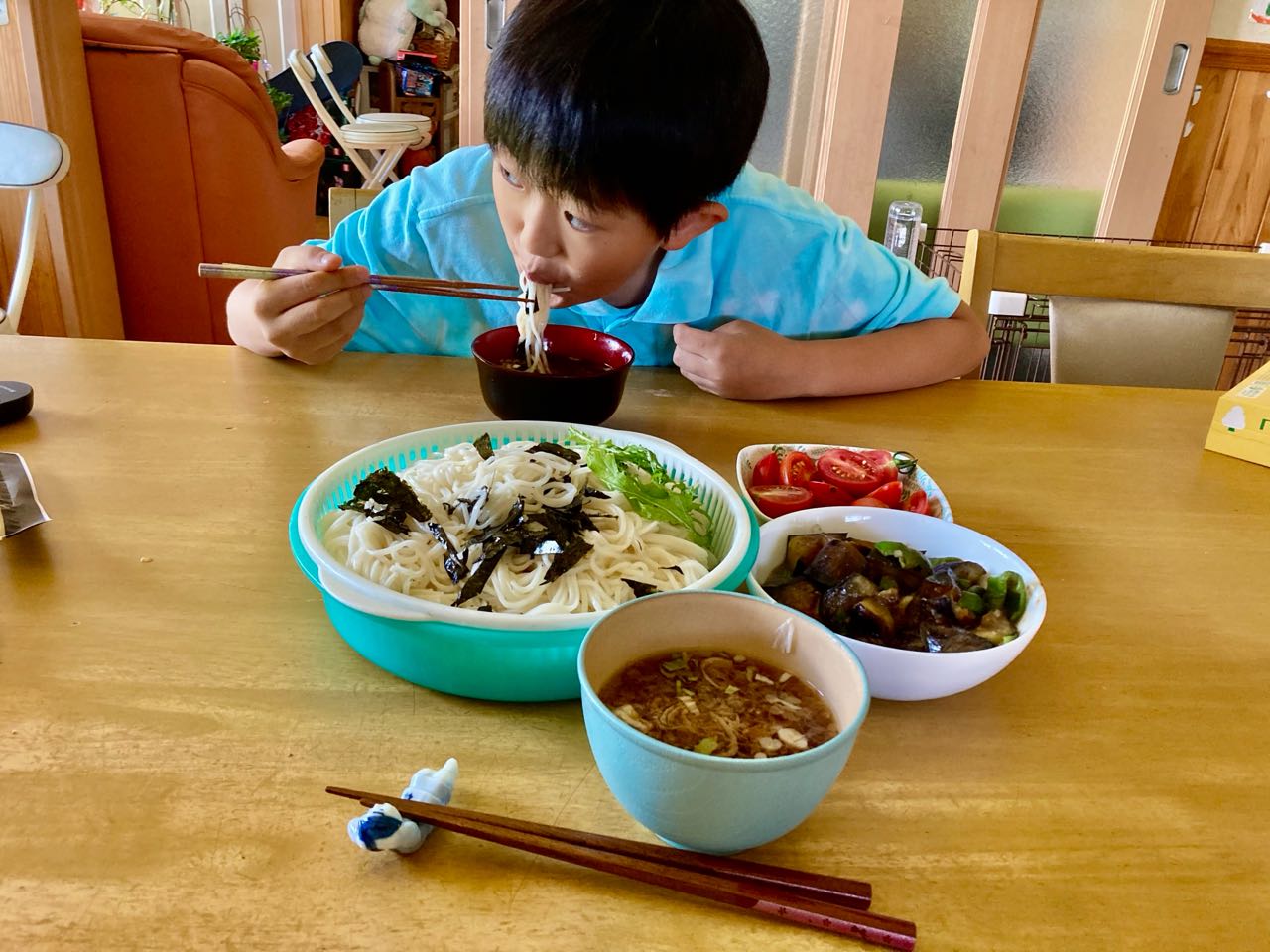 29日→土曜日、孫2人が.お昼近くに来て、ちゃあちゃん→「ひやむぎ」を.食べたいと.言ってきました.早々に.「ひやむぎ」を茹で揚げて、揚げましたら、2人で、海苔を、切り刻んでいました、私は、今朝、取ったばかりの「茄子と.ピーマン」の、味噌炒めと、今朝、取ったばかりの.新鮮なトマトを、食べやすく.切って出してあげました。喜んで食べていました。