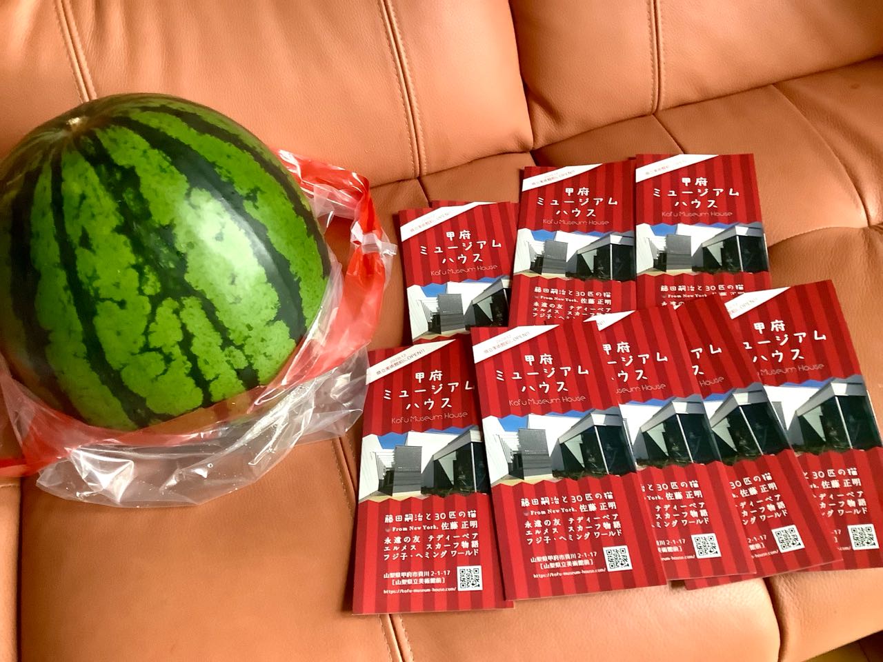 1日.甲府ミュージアムハウス館長の.田辺文子さんが、大きなスイカと、入場券10枚を届けてくれました.ご覧になって下さい、いつも、お忙しいのに、感謝の気持ちでいっぱいです、甲府ミュージアムハウスは、県立美術館の、道路を挟んで北側です、