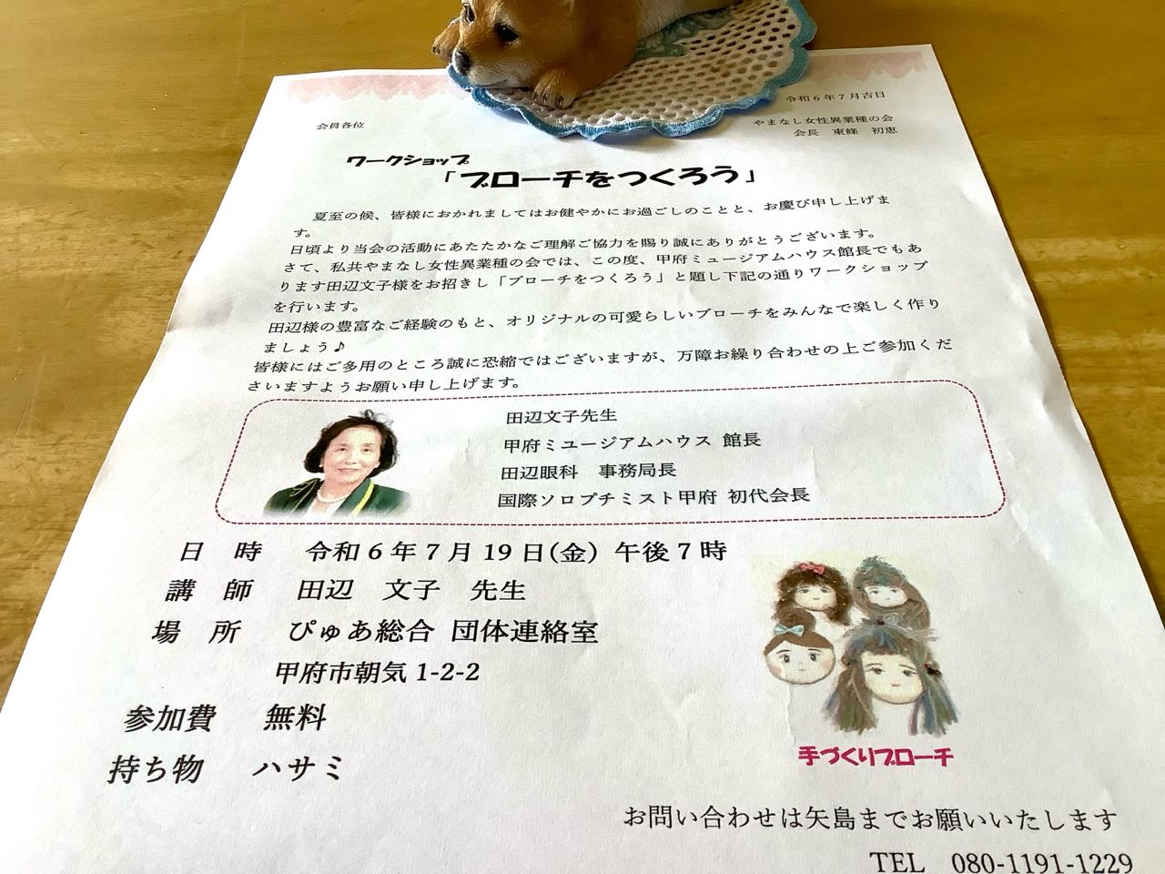 19日. 19時→21時まで、山梨県、ピュア総合会館に於いて、やまなし女性異業種の会→7月の定例会を開催しました、今回は→国際ソロピスニスト甲府の会長、田辺文子事務局長、甲府ミュージアム館長に、講師として、来ていただき、人形のブローチを.つくりました。会員の皆さん→とっても上手に.でき上がりましたので、この