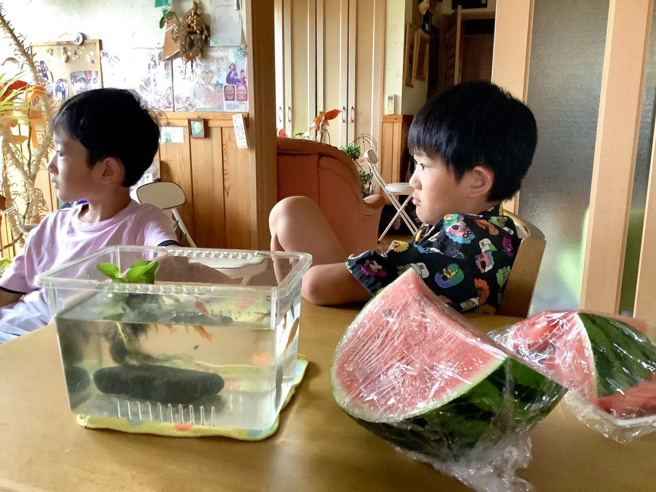 2人は2回ずつ.すくって、 20匹ほど→小さなビニールの袋入れて、持って、帰ってきましたが、家に帰ったら、もう.半分死んで.いました。が、生き残った、金魚を、今朝→水槽に入れました。.キンギョを、売っていた、お兄さんが、僕たち→そんなに、沢山、すくって.育てられるのと.聞いたそうです、が、大丈夫→ちゃあちゃんが、育てるから...去年の夏祭りの金魚も、まだ生きて、いるからと、言ったそうです、