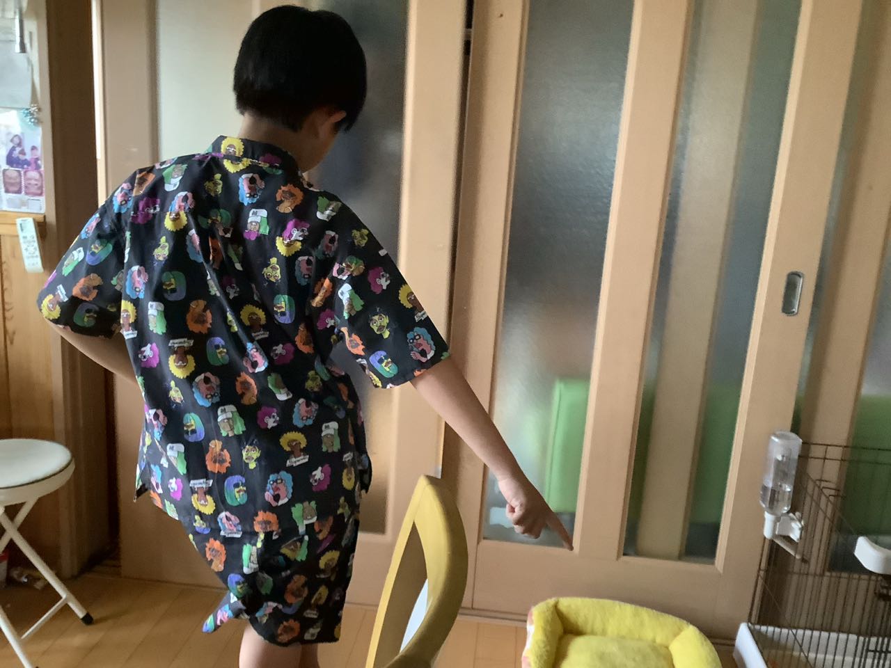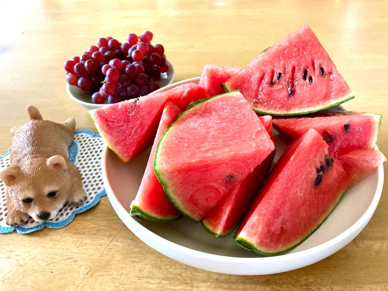 犬の→トイプードルも、スイカを食べていました。とっても甘くて.美味しい→スイカでした、孫の洋服には、楽しそうな.外国人の、面白い顔がいっぱいで、ビックリです。休日らしい感じがしました、ご覧になって下さい、