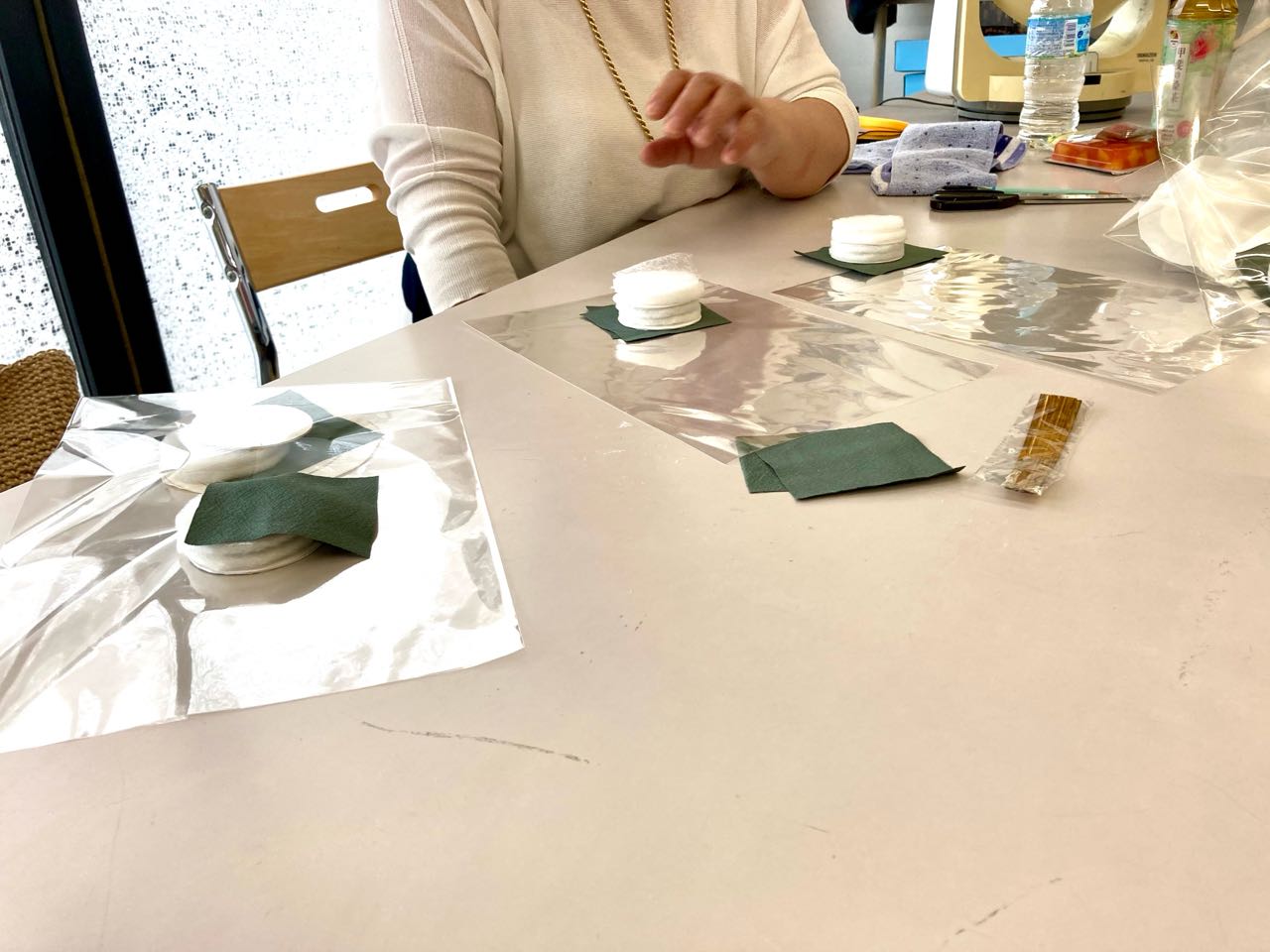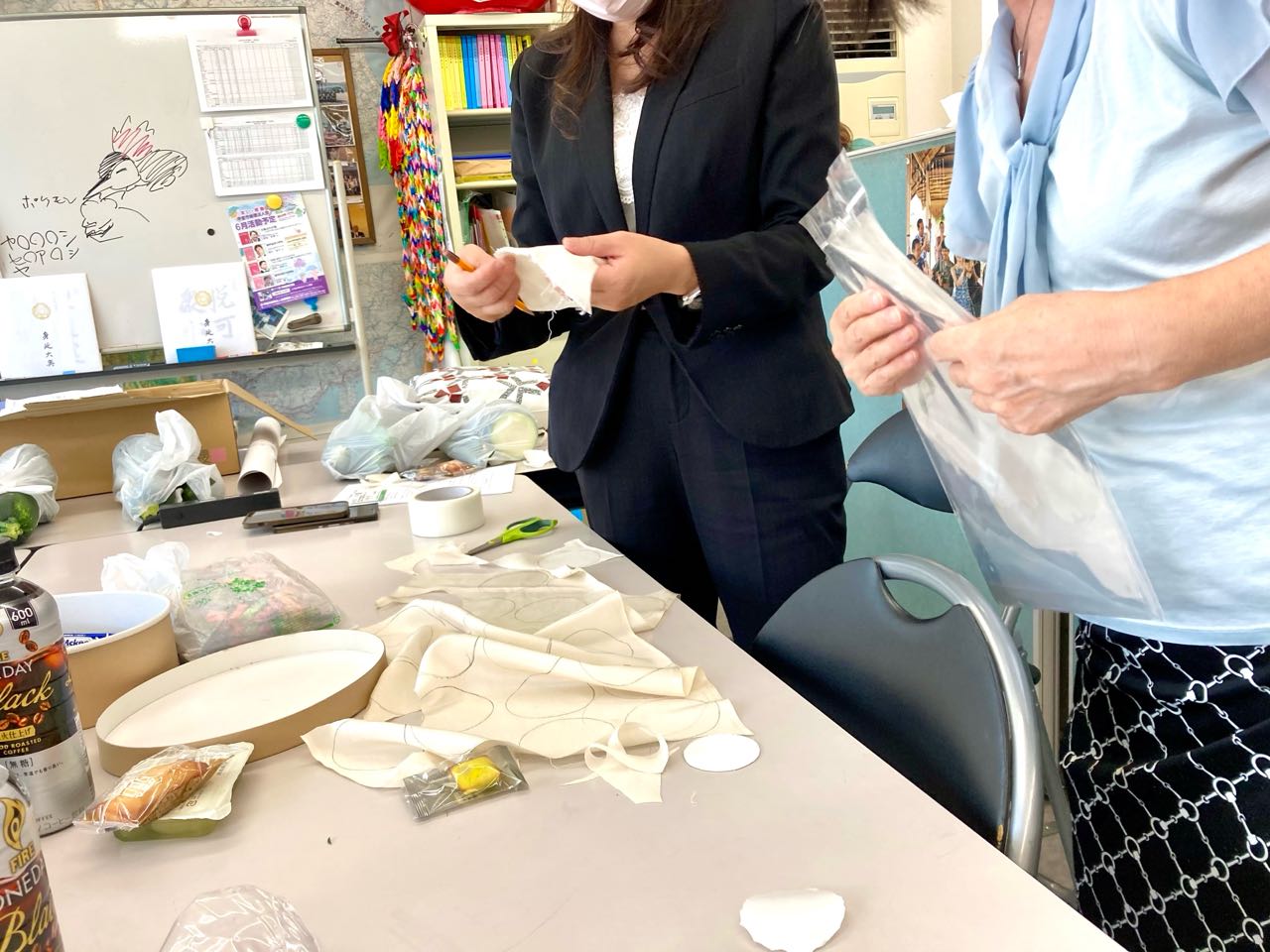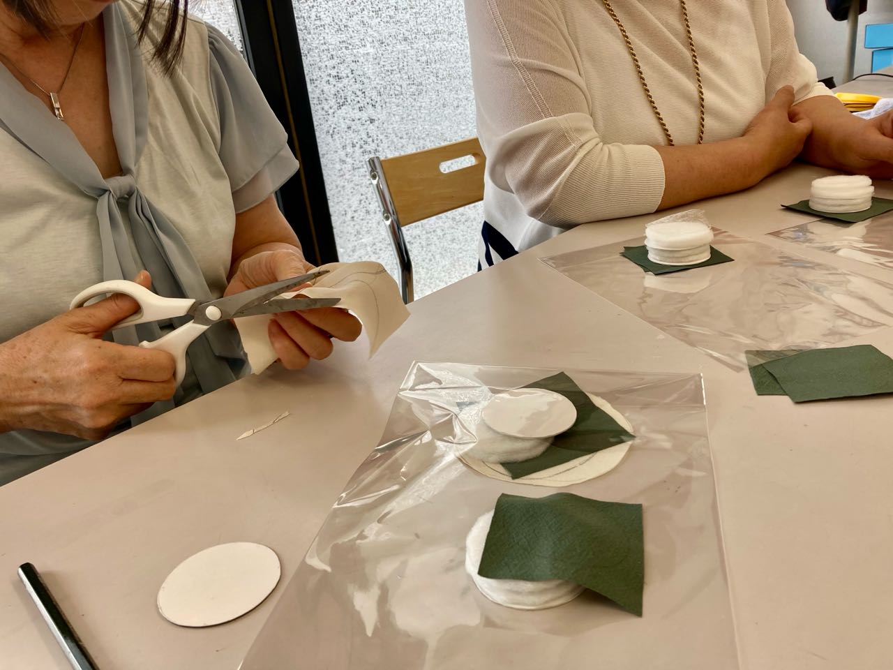 10日.午後13時から、今月の、やまなし女性異業種の会の、定例会は、19日、手芸教室事の事前準備に、中谷事務所の、会議室を、お借りして、役員が4人で、準備して、布地や、厚紙を.手際よく切り揃えました、終わってから、花輪副会長が京都に、出張した、美味しいお土産や、和出さんからは、伝六まめを、頂き、和やかに.終了しました、ご覧になって下さい、