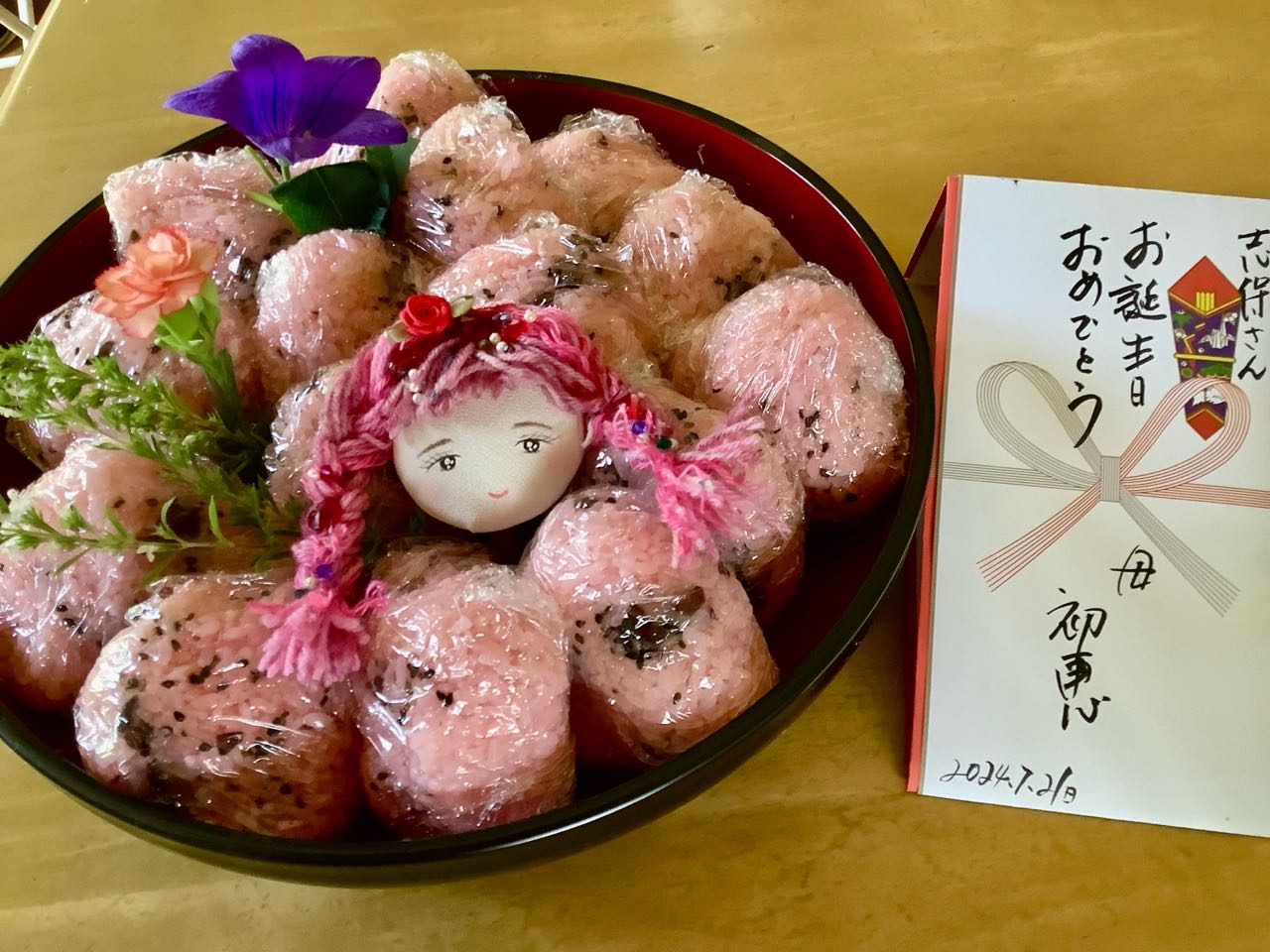 桔梗の花と、カーネーションの花と、ミントの白い花は、おうちの庭に咲いていた花を、添えて写真を撮りました、お祝いの袋の裏側、中側には、書き切れないほどの、お祝いの→メッセージの.言葉をいっぱい添えて、送ってあげました。