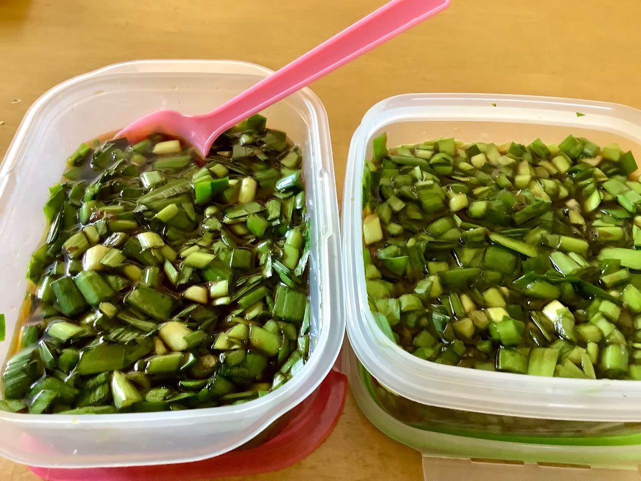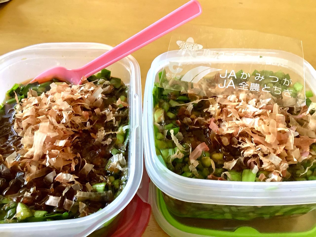 栃木県特産のニラを買って来て、ニラの醤油漬けも.しました、お豆腐に添えると、とってもおいしい.ニラの醤油と、オカカ漬けです。ご覧になってください。、