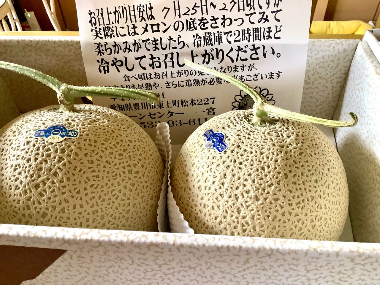 24日.静岡県浜松市三ヶ日町にお住まいの、井口登志男さんから、愛知県豊川市..グリーンセンターの.高級メロンが届きました、箱を開いてみたら、お召し上がりの、目安が←きちんと書かれてあります、送り主の.井口さんは.以前に→静岡県三ヶ日町農協の、総務部長をしておりました.私が若い頃.三ヶ日町、農協の女子職員研修に.講師として、依頼されました、それ以来の→長いお付き合いを.させて.いただいております.今でも.こうして.高級メロンが届いた事は.本当に嬉しく感謝しております。素晴らしいメロンを.ご覧になってください。