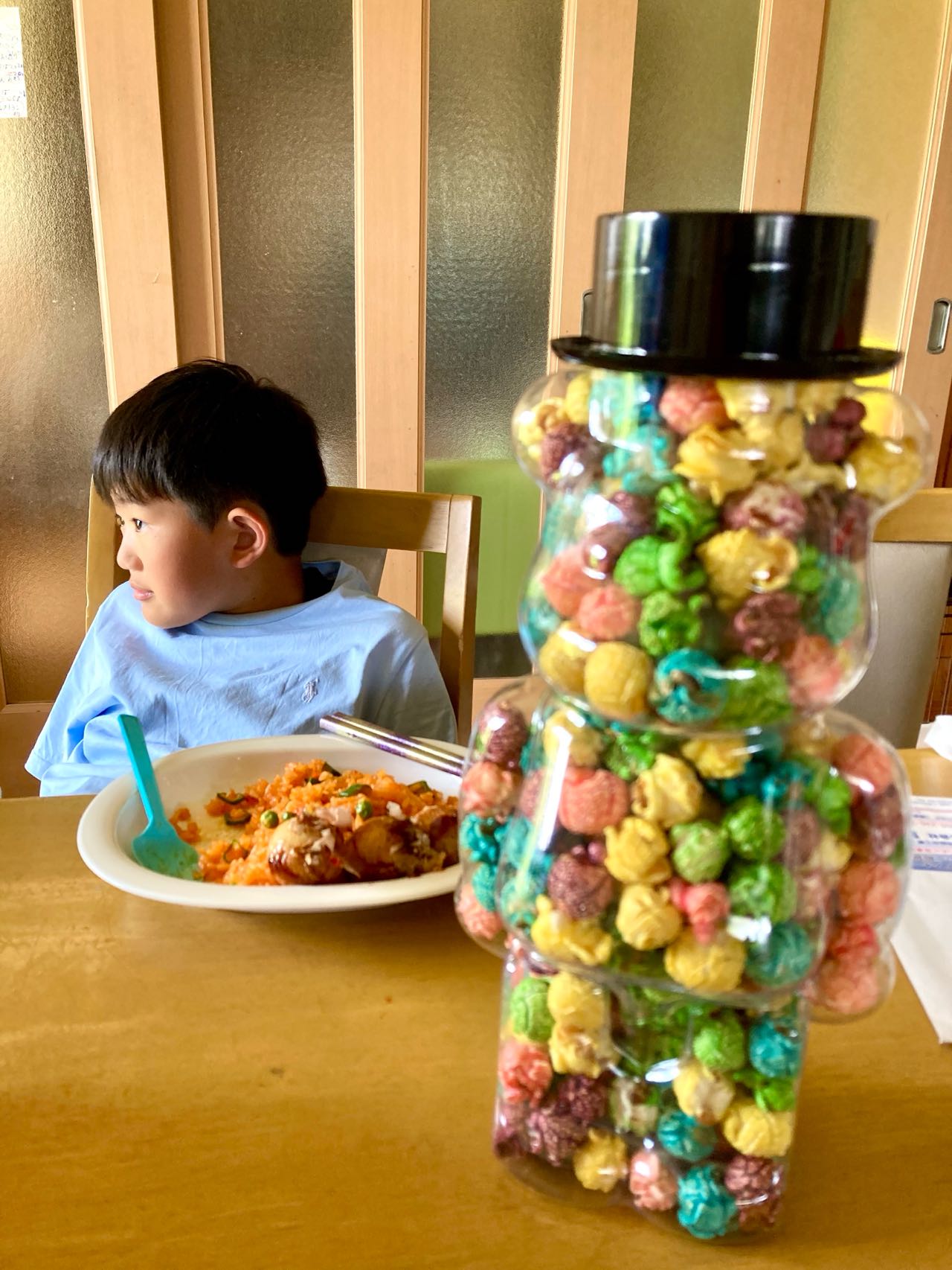 26日.今日の、♪ちゃあちゃ.☆レストランの☆メニューは.♪♪チキンライス+たこ焼き.2個付きです。これは、美味しいナ..と、言ってパクパク食べていました、手前にある、大きな、ホップコーンは→ゲームセンターで.釣り上げたそうです.