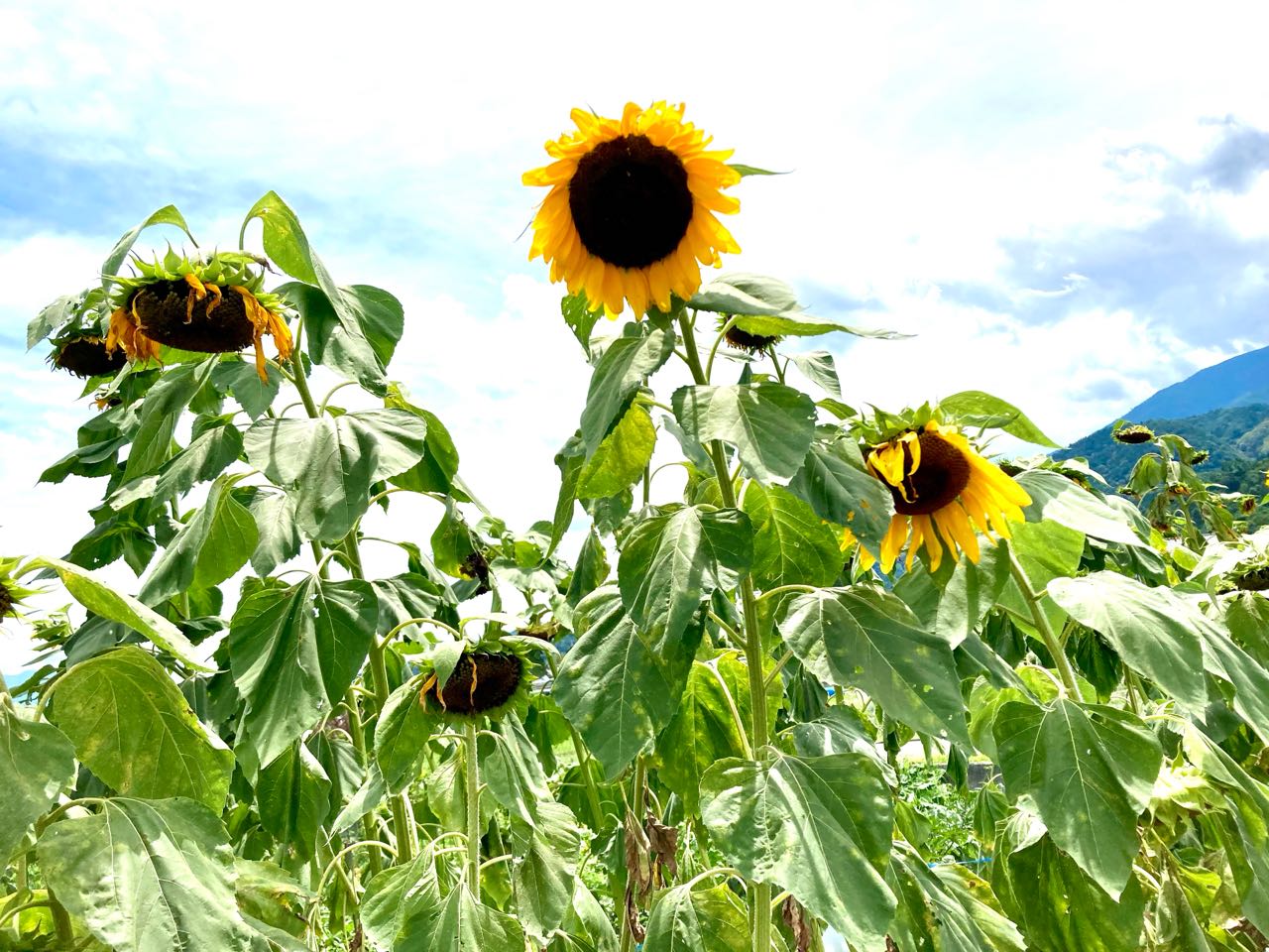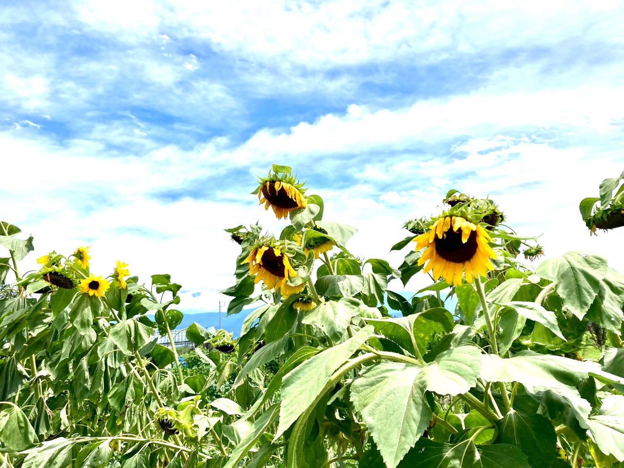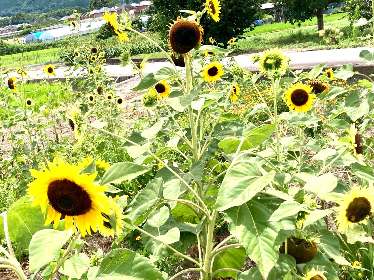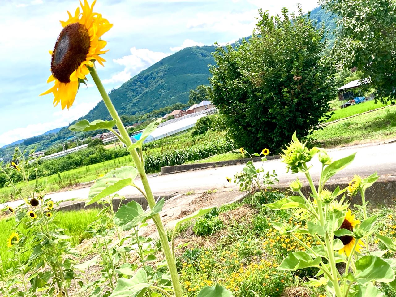 28日.南アルプス市、飯丘地区の・高畑さんが、毎年、ひまわりの花を.沢山.畑に咲かせていると、テレビのニュースで、先日、拝見しましたので、今日は、午前中、1人で.花を見に行って.来ました.狭い道で、「ひまわりの畑」が.中々見つからなくて、私の車が大きいので、狭い農道は.とても苦労しました。、やっと見つけて、写真を撮って来ました、ご覧になって下さい、