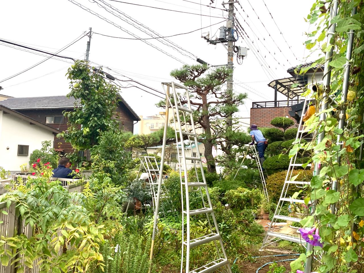 昨日.→→ 雨の中ですが、毎年.庭の管理を、していただいている、南アルプス市の、「明桃園」さんの、庭師が、6人、入って、庭の整理をしてくれました、