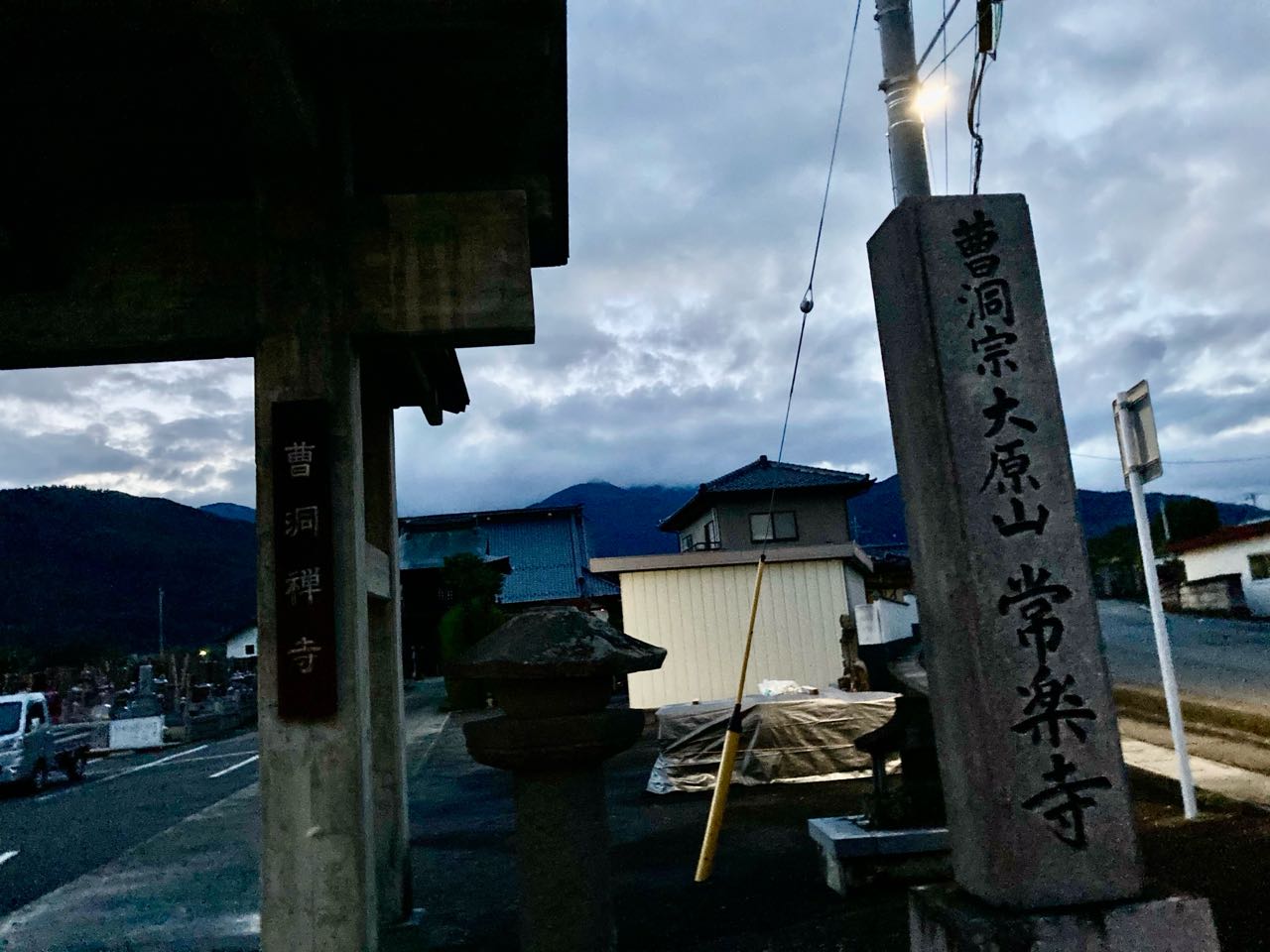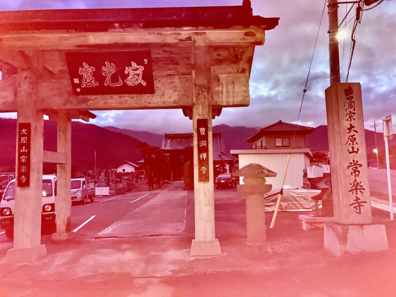 夕闇の中ですが、常楽寺の正門と.閻魔大王様の写真を、撮ってきましたので、ご覧になってください、