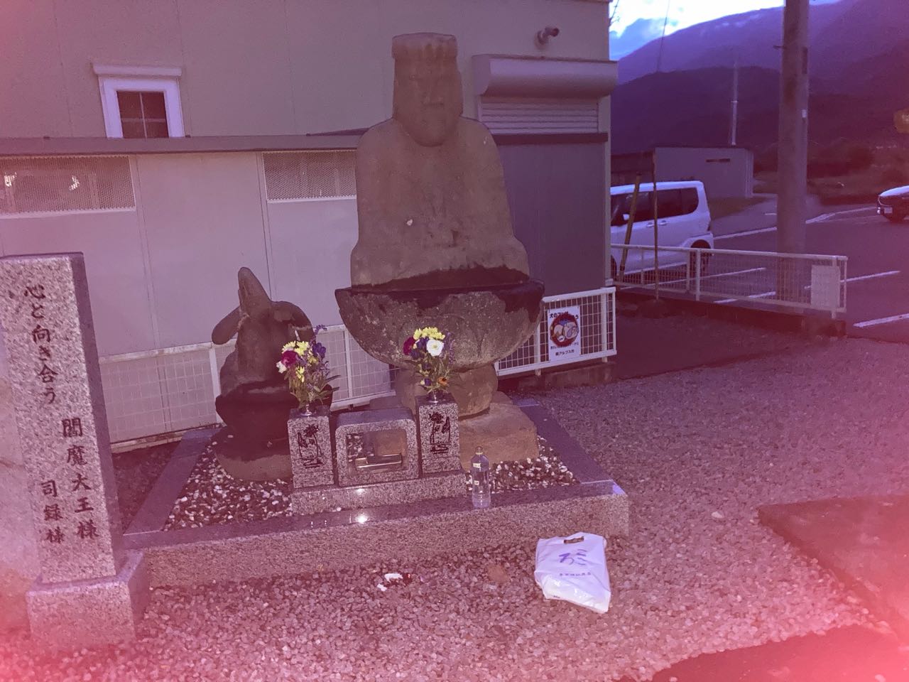 6日(昨日).夕方、17時40分→南アルプス市飯野の、常楽寺の正門前に、閻魔大王様と、書家様が並んで、祀られています。もっと、早い時間に、お参りに行こうと思っていましたが、今日は午後から所用があり、お参りするのが、遅い時間に、なってしまいましたが、お花と→線香と、→お水を、たむけて来ました、