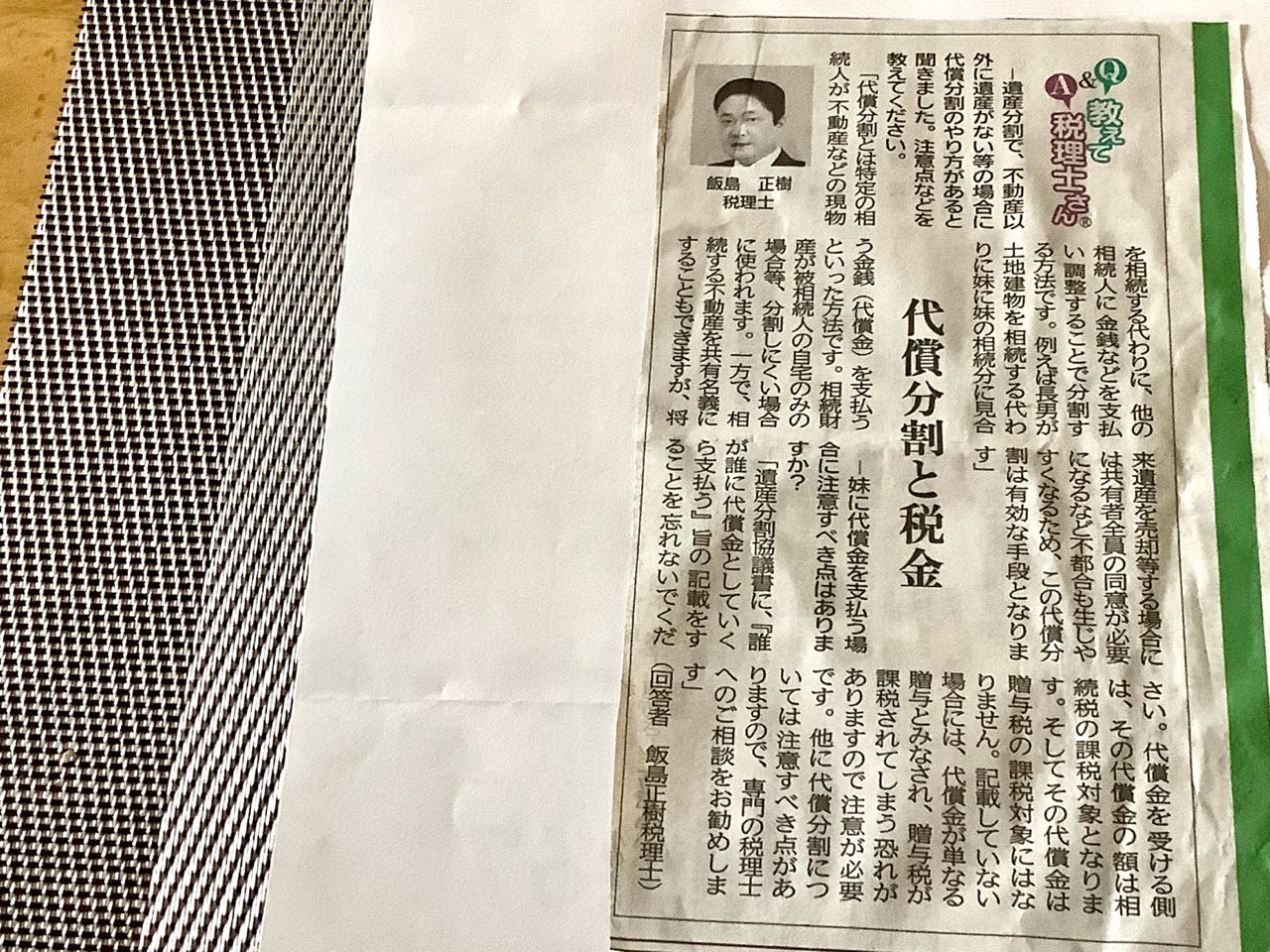 先日の、山日新聞に、甲府市に→お住まいの、税理士→飯島正樹先生が、「代償分割と税金について」新聞に載っていました。遺産分割で、不動産以外に遺産がない等の場合に、代償分割のやり方の、注意点、等が、わかりやすく載っていました、