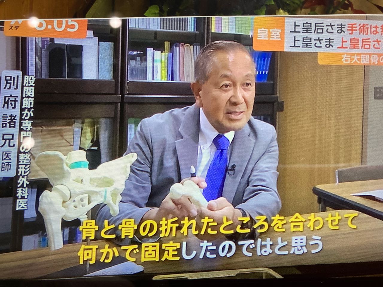 8日.夕方.6時のニュースで、上皇后さまの、股関節の手術の、説明をしている、股関節が専門の整形外科医師→別府諸兄先生です、今から.15年ほど前に、聖マリアンナ病院で、整形外科の教授をしていました、